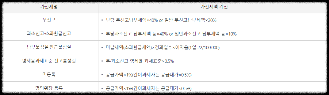 부가세 신고를 잘 못 신고하거나 미신고 하게 되면, 추가적인 가산세 발생으로 불이익을 당하게 됩니다.