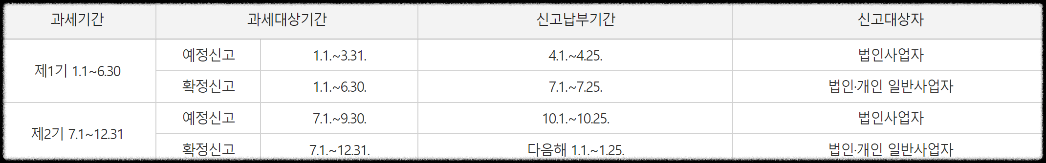 부가가치세는 6개월 단위로 과세되며, 각 6개월의 과세기간을 다시 3개월 단위로 나누어 중간에 예정신고기간을 둡니다.